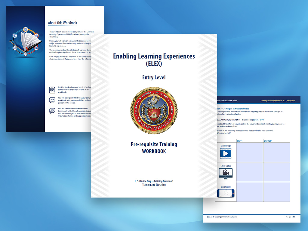 This Enabling Learning Experiences (ELEX) Moodle Training was designed and developed for the U.S. Marine Corps - Training Command. This web-based training and instructor-led training consists of two full courses. One developed called "Assessing" Learning Experiences (ALEX) and another called "Enabling" Learning Experiences (ELEX).